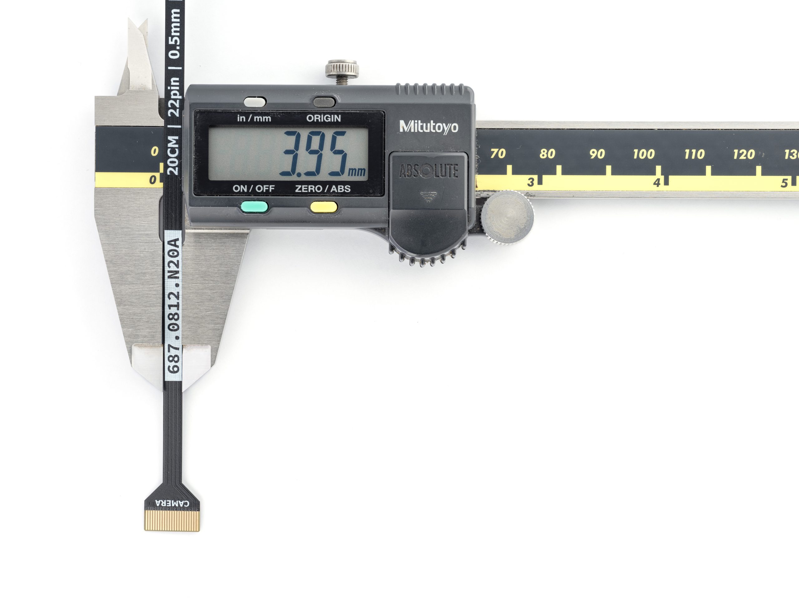 687.0812.N20A is a Kurokesu designed, impedance matched, 4-layer FPC (Flexible Printed Circuit) cable. It is built for applications where every millimeter matters – the width after the fan-out from the connector is just 4 mm while maintaining four differential lanes with proper impedance control.